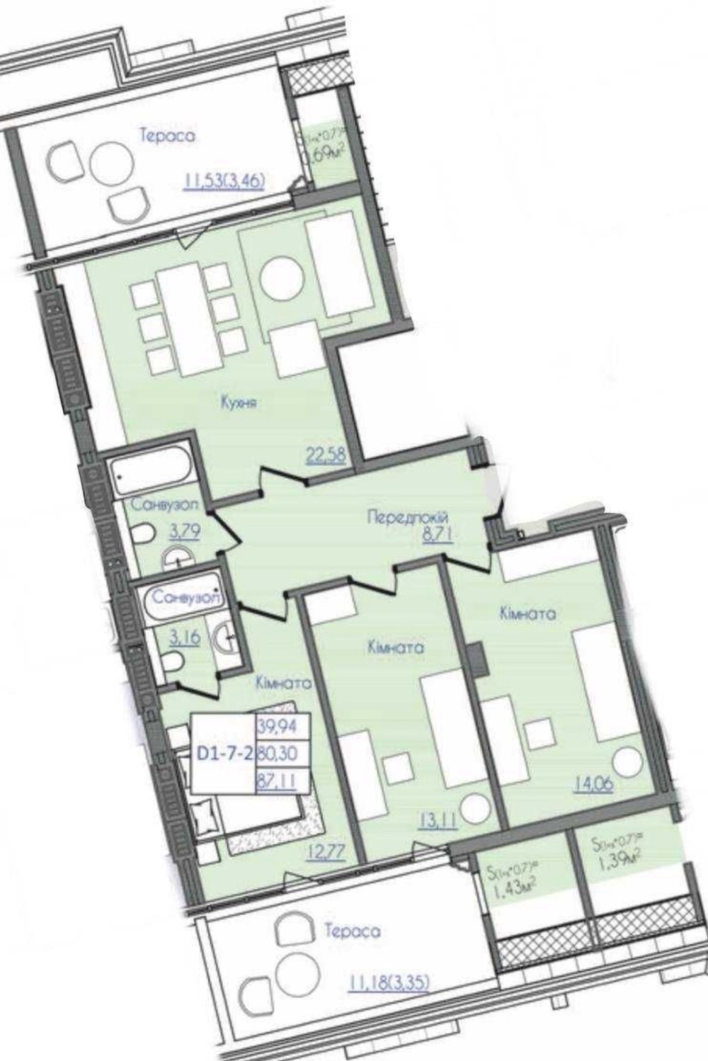 • Площа: 87/60/27 м²